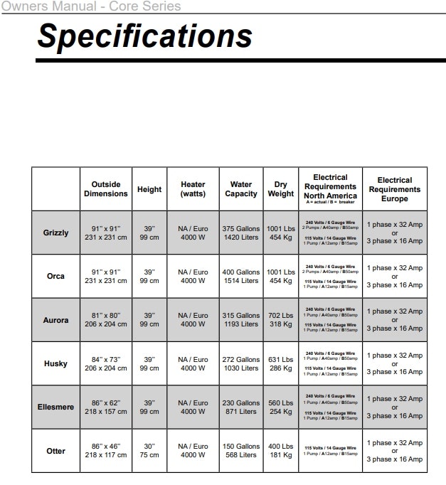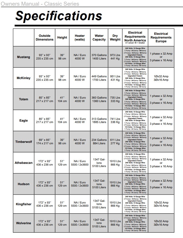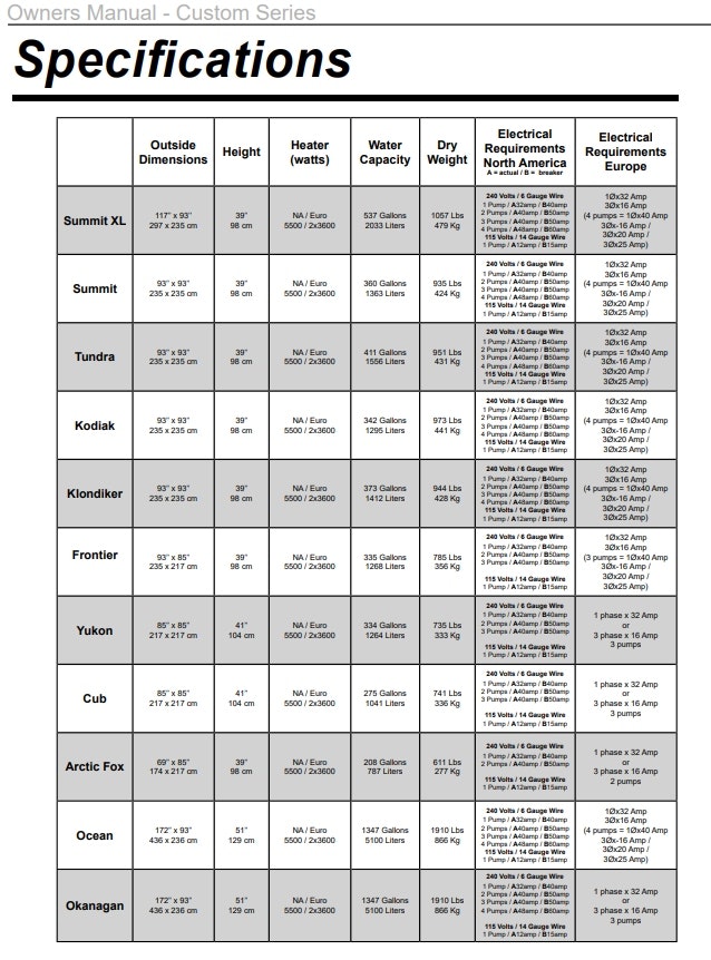 Use the arrows to go forward or back to scroll through the photos for more information on the Spa Specs. (You can also find these specifications in your owners manual. See Pg.29 for Custom Specs, Pg.40 for Classic Specs, and pg.56 for the Core Specs)