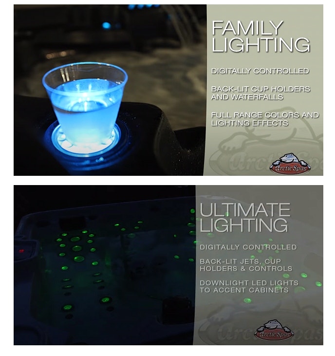 Family Lighting Package (FLP): The Family Lighting Package features 2 underwater lights and uses elegant backlighting of the controls and drink holders along the top lip area of our spas. Additionally, “water-rope” waterfalls are also backlit.