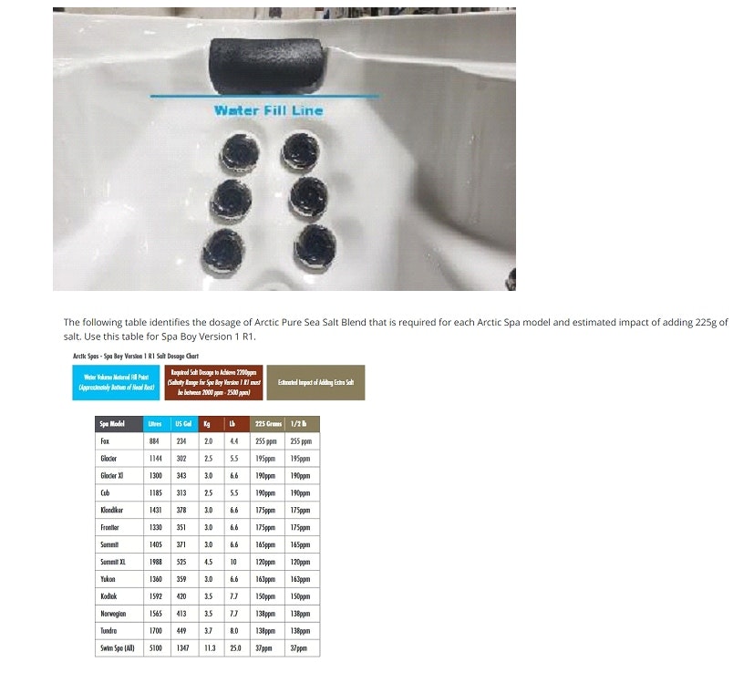 The following table identifies the dosage of Arctic Pure Sea Salt Blend that is required for each Arctic Spa model and estimated impact of adding 225g of salt. Use the table for Spa Boy Version 1 R1. (shown in the picture on the left)